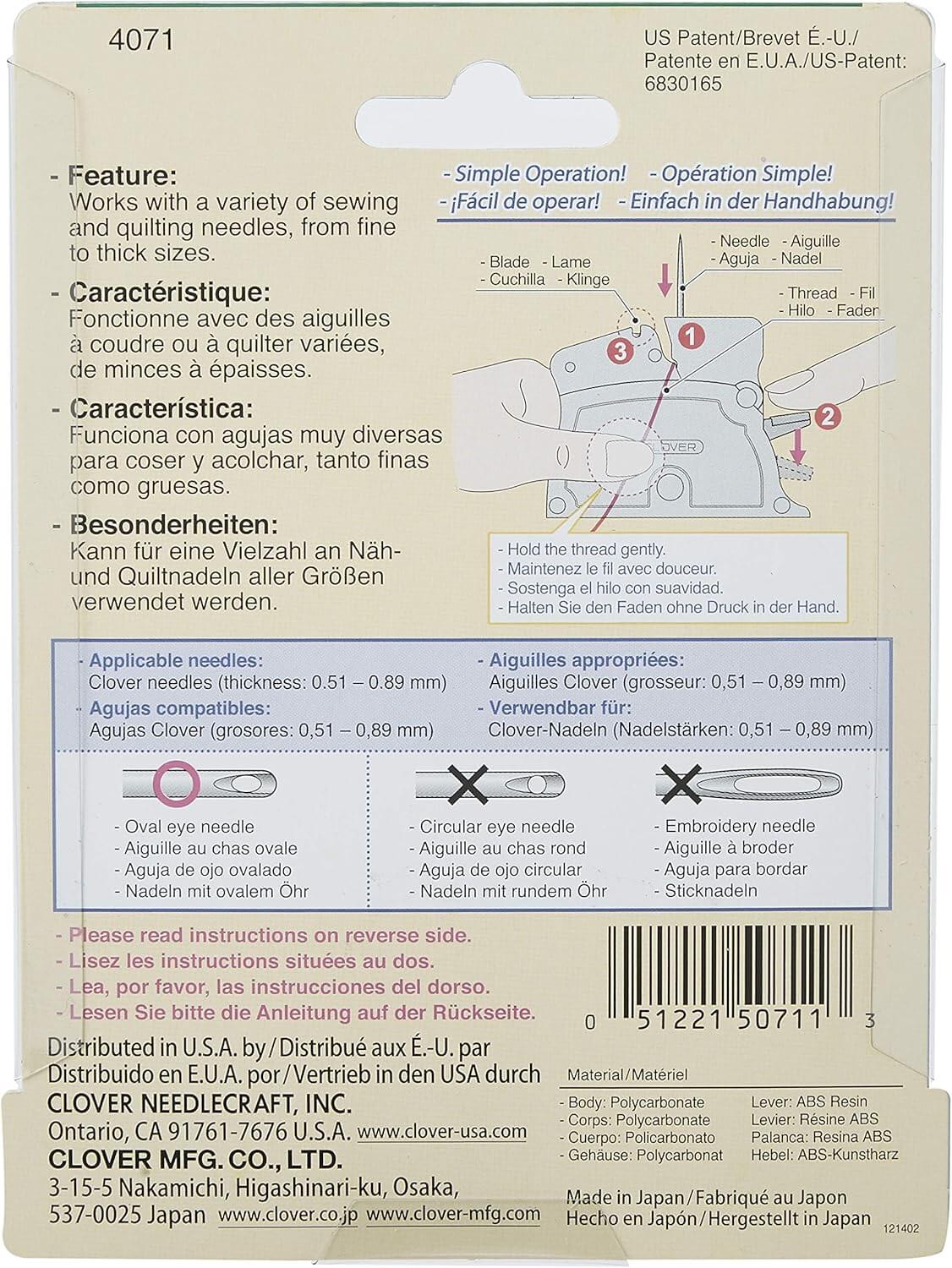 - Compatible con múltiples agujas: Funciona con la mayoría de agujas de Clover que tengan el ojo ovalado (grosores de 0,51 a 0,89 mm). Importante leer las precauciones.