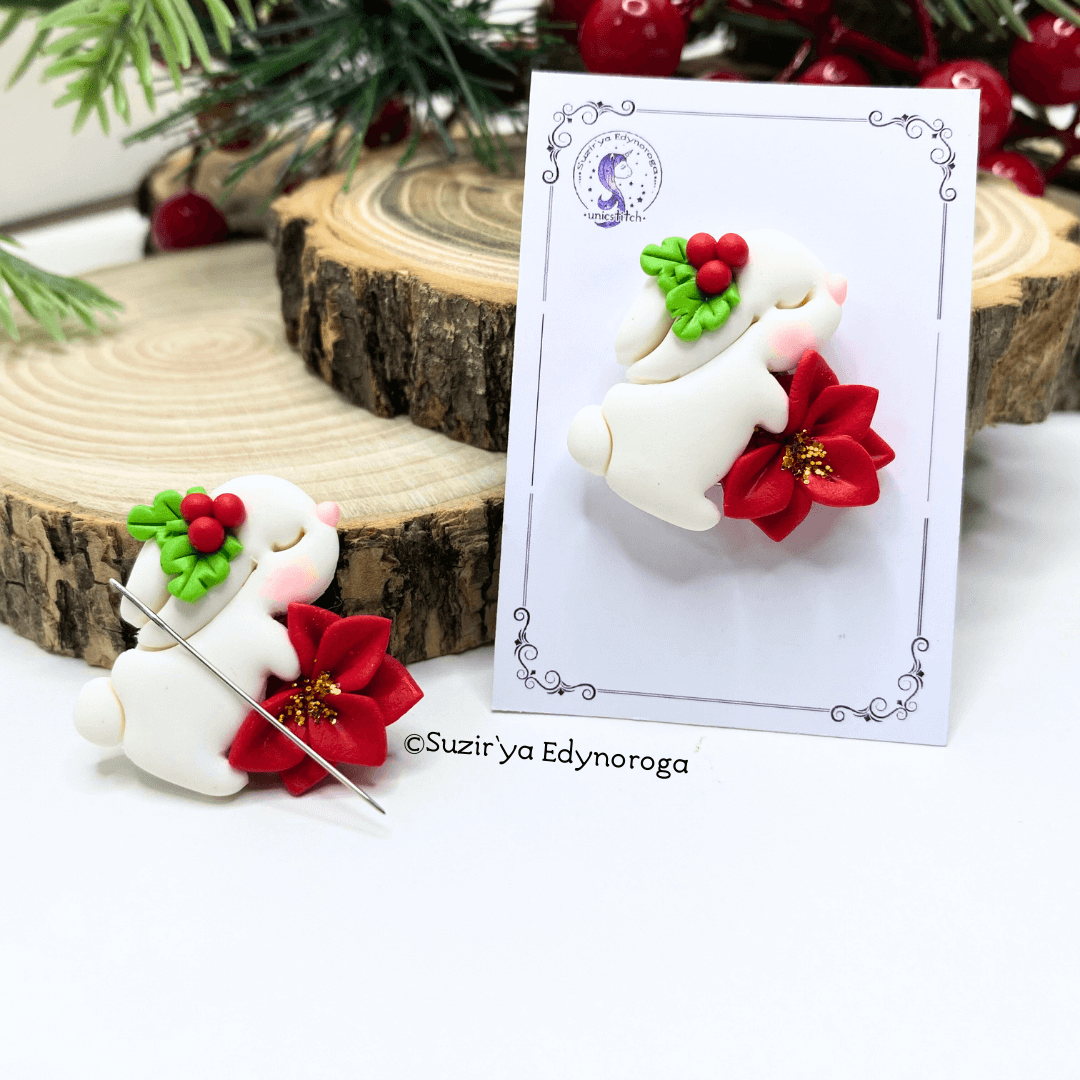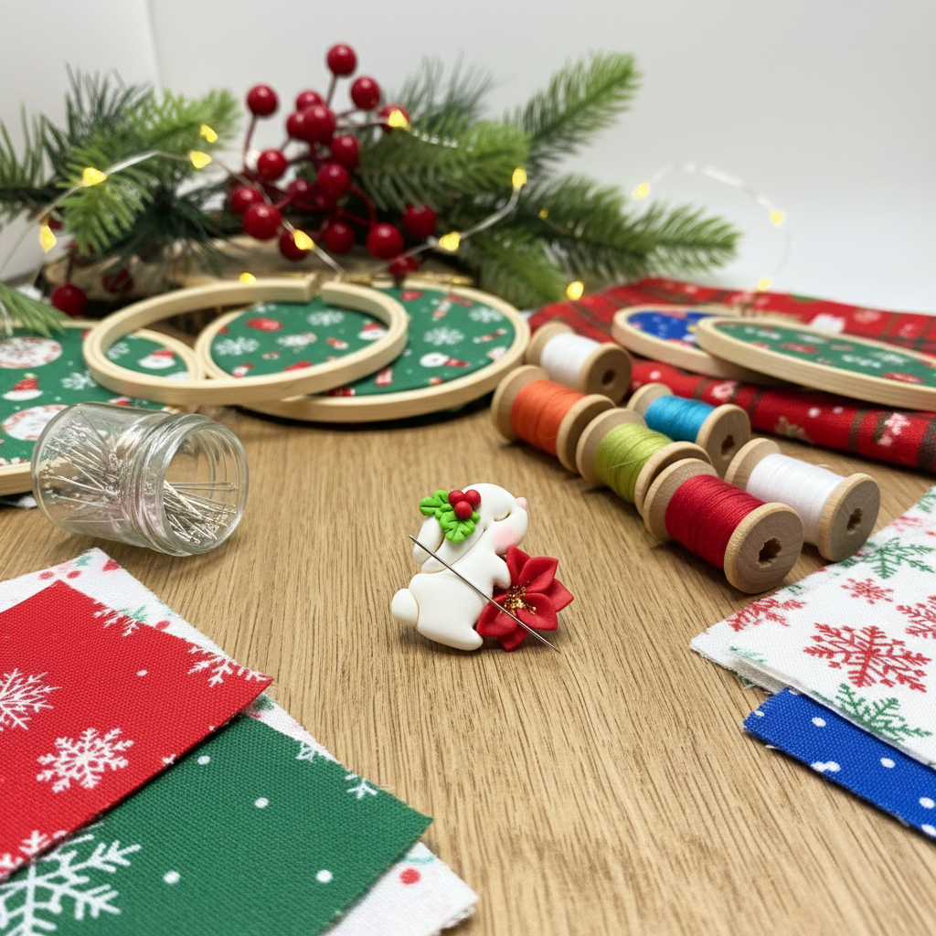 Este precioso imán sujetaagujas con diseño de conejo y flor de Pascua aporta un toque navideño y elegante a tus proyectos de bordado. Hecho a mano en Ucrania en arcilla polimérica por Natalia, artista de Suzir’ya Edynoroga, combina funcionalidad y encanto en una sola pieza.