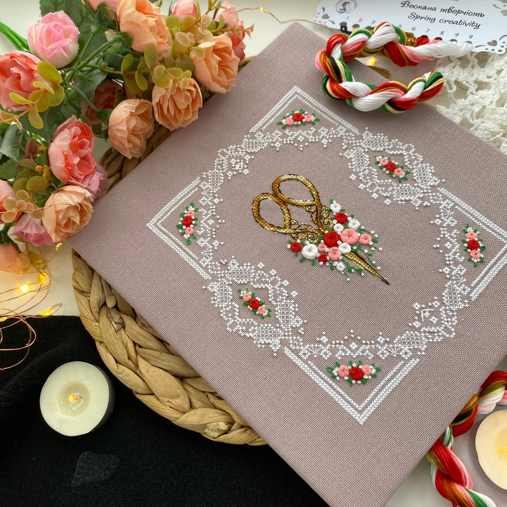 El kit de punto de cruz y bordado "Creatividad Primaveral Tijeras" de la marca ucraniana Suzir’ya Edynoroga es una escena llena de flores y detalles que celebra la llegada de la primavera y la creatividad.