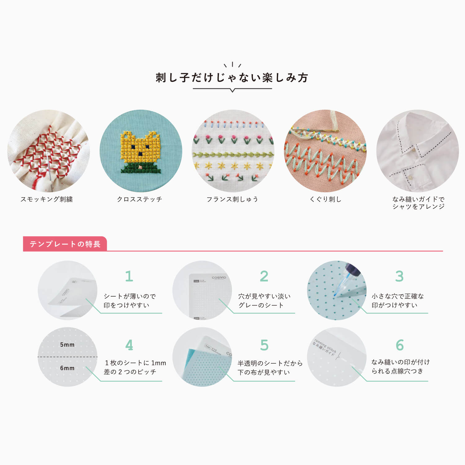 Ideales para bordado Sashiko, también puedes utilizarlas en técnicas como el smocking, bordado tradicional y punto de cruz. Cada plantilla tiene dos tamaños de rejilla, con una diferencia de solo 1 mm, lo que te permite adaptar el diseño a tu proyecto con total precisión.