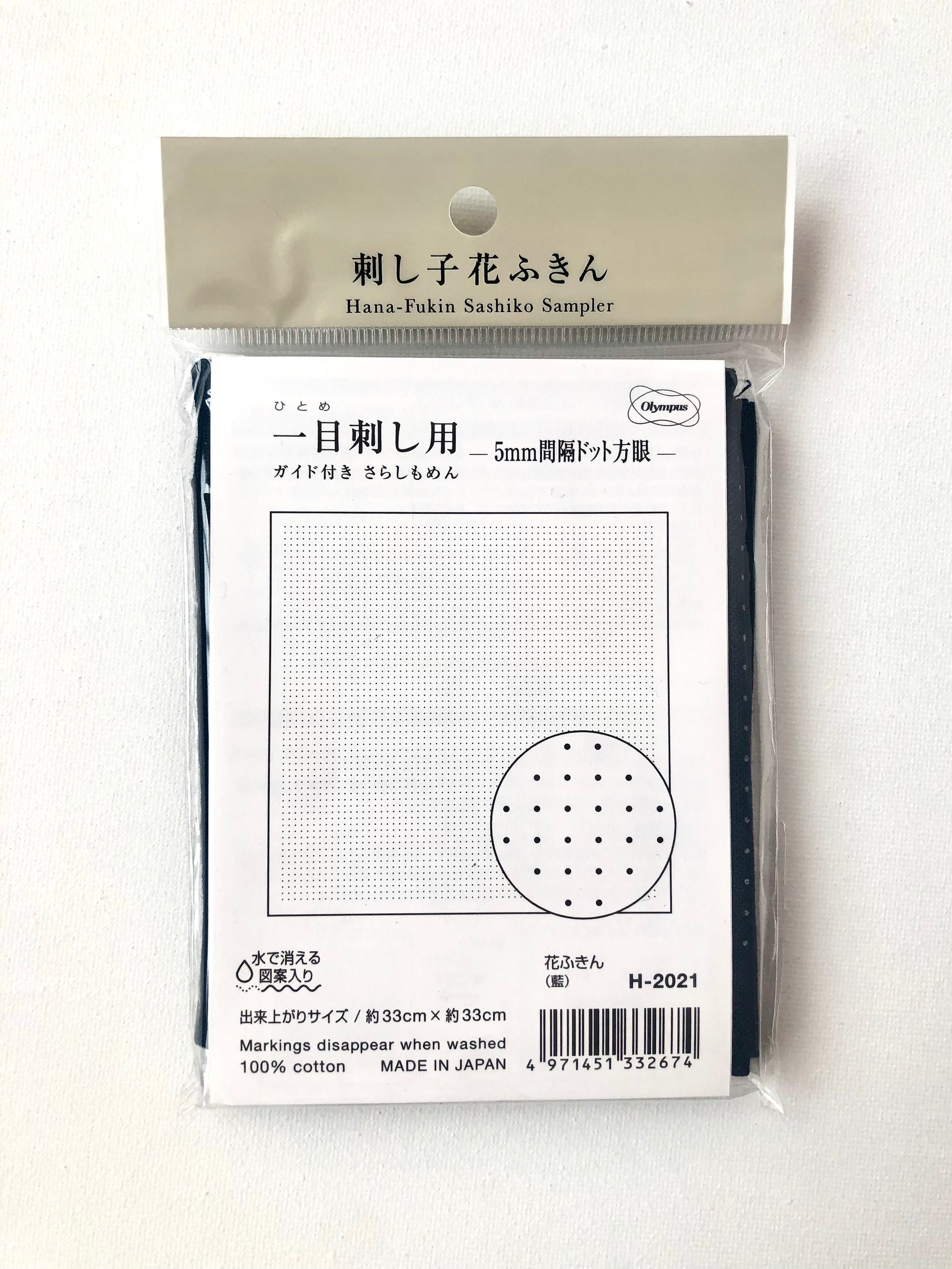 Tela de color índigo con cuadrícula de puntos para Sashiko de la marca japonesa Olympus. Esta tela viene impresa con una cuadrícula de 3mm, lo que la hace perfecta para diseñar tu propio sampler hana-fukin, experimentar con puntadas más pequeñas o combinar patrones que usan una cuadrícula de 6mm con una de 3mm.